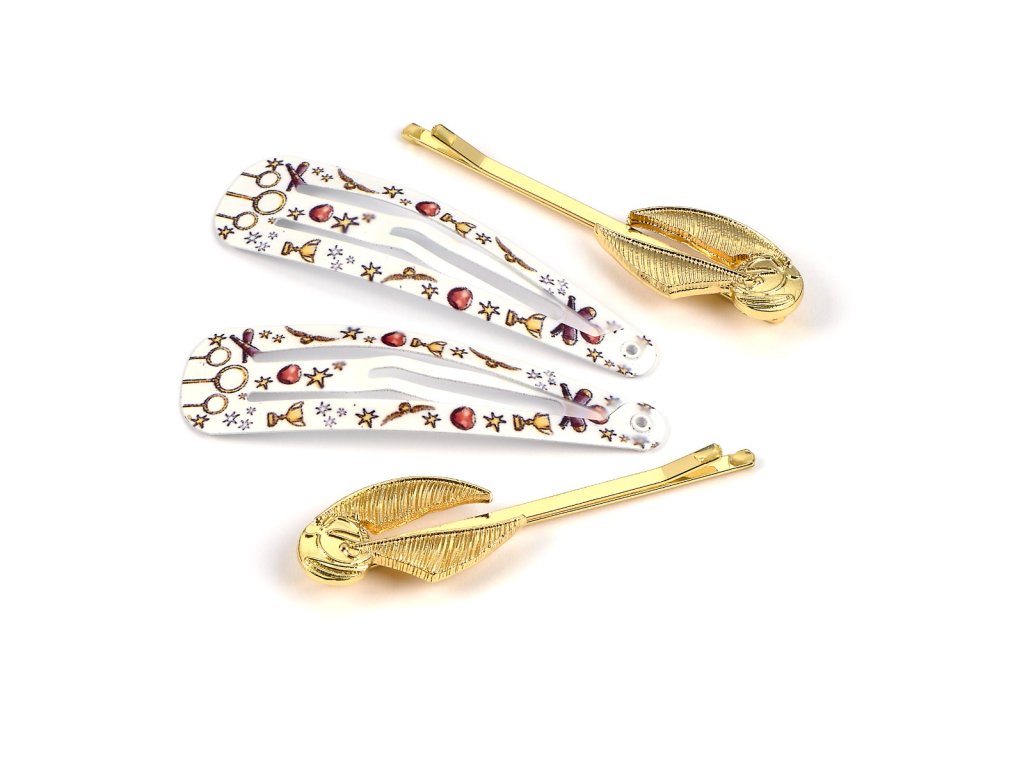 Balení obsahuje dvě zlaté sponky se Zlatonkou a dvě klasické vzorované sponky s motivy Harry Potter.