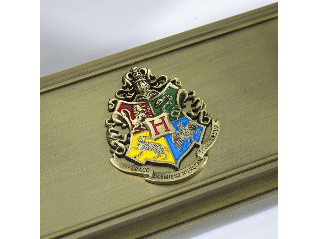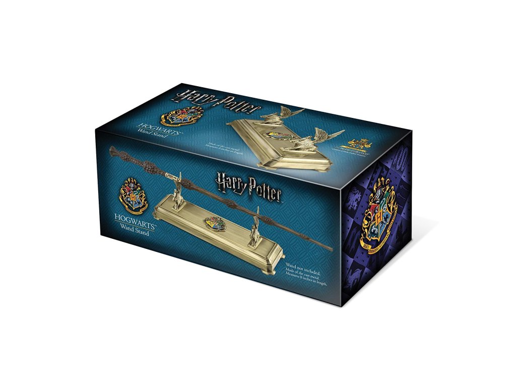 Stylový stojan na vystavení kouzelnické hůlky ze světa Harryho Pottera. Ve zlaté barvě s emblémy a symboly školy čar a kouzel v Bradavicích.