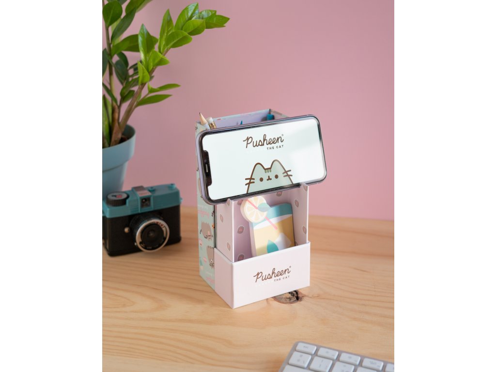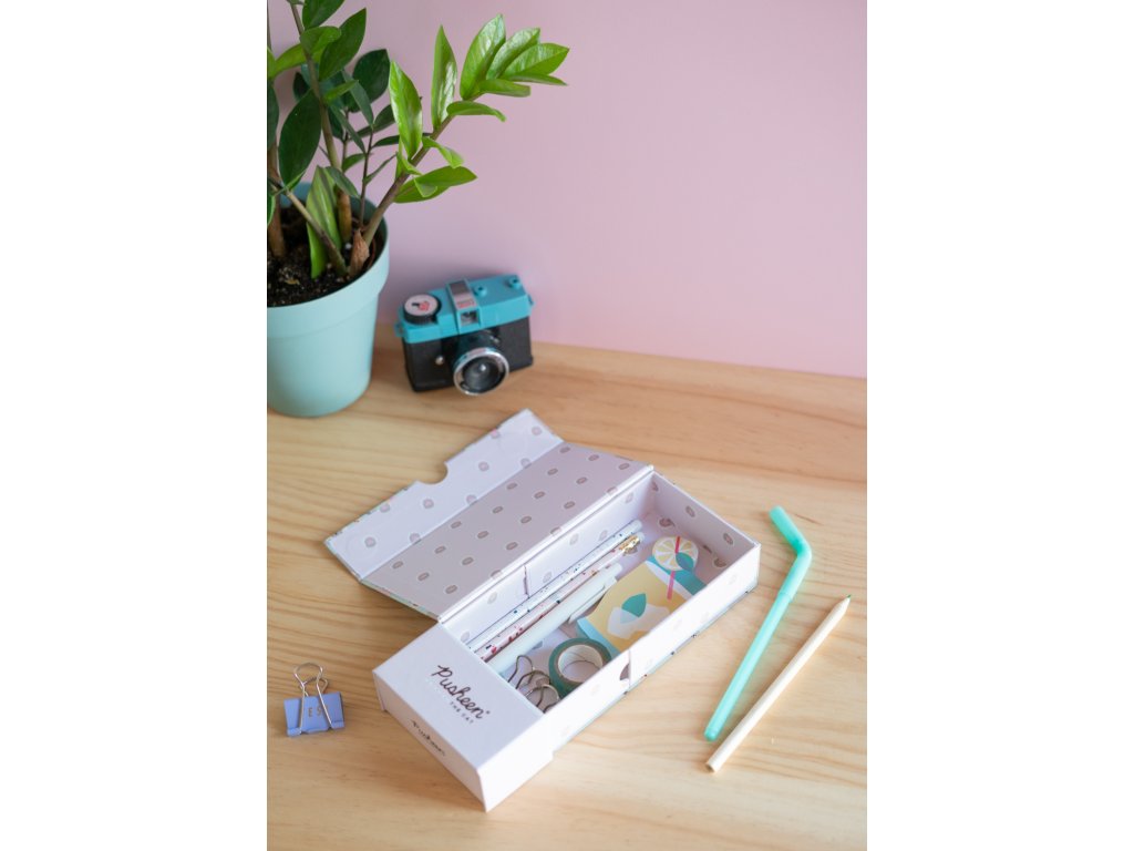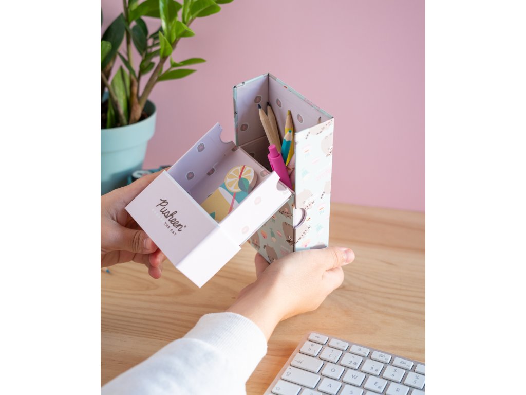 Slouží jako penál nebo držák a stojan na mobilní telefon. 3 položky v 1. Je vyroben z pevného 1,5mm kartonu, potaženého 125g papírem s matným povrchem. Měří 22,5 x 9,5 x 4cm.Doplňkové parametry