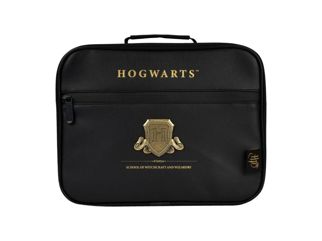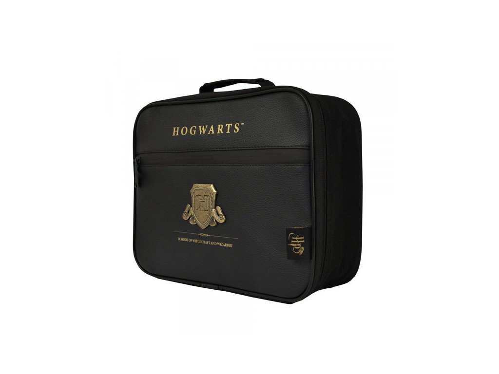 Černý svačinový box se zlatými nápisy a logem školy čar a kouzel v Bradavicích. Elegantní úschovna na vaše jídlo do práce, školy nebo třeba na výlety.
