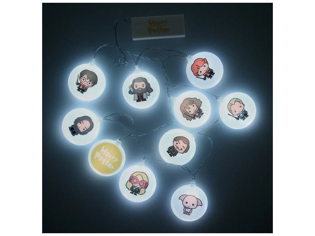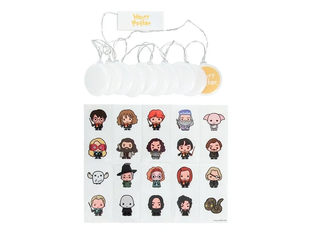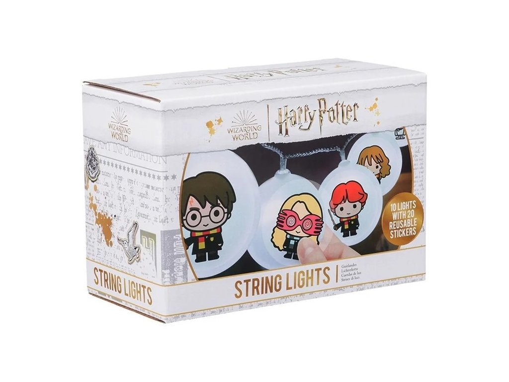 Balení obsahuje 10 LED světýlek na řetězu a 20 ks znovu použitelných nálepek s postavičkami Harry Potter.