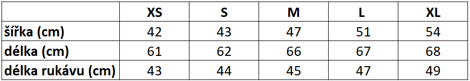 Velikostní tabulka: