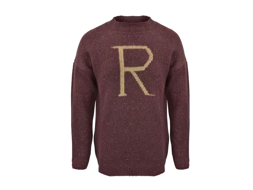 Stylový pletený svetr inspirovaný Ronem Weasleym z kouzelnického světa Harryho Pottera. Tento červený svetr s výrazným písmenem „R“ na hrudi připomíná ikonický dárek od paní Weasleyové, který Ron nosil během Vánoc v Bradavicích.