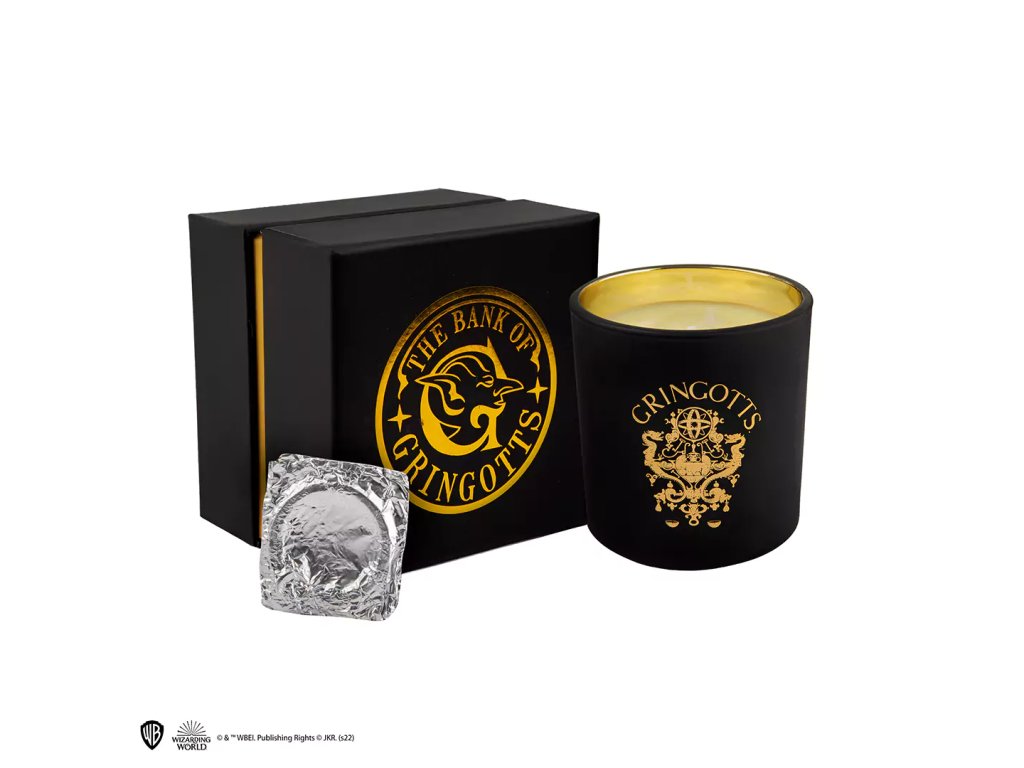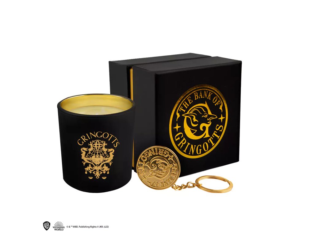 Svíčka Gringottova banka s přívěskem ve tvaru kouzelnické mince v krásném dárkovém balení.