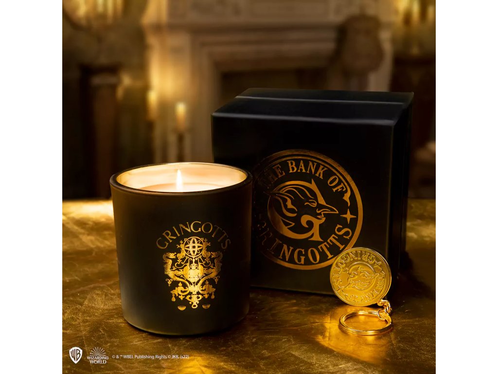 Svíčka ze sójového vosku, kokosového oleje a včelího vosku, ve stylové sklenici potištěné motivem nejslavnější banky kouzelnického světa. Svíčka má vlastní přívěsek ukrytý ve vosku. Po zapálení svíčky se vám odhalí.