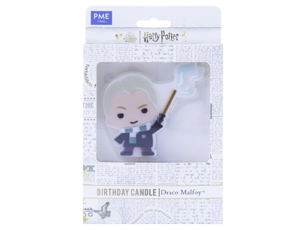 Balení obsahuje: 1 x dortovou svíčku vyrobenou s parafínovým voskem v designu Draca Malfoye. Knot je umístěn v hůlce, aby nedošlo k popálení obličeje postavy.