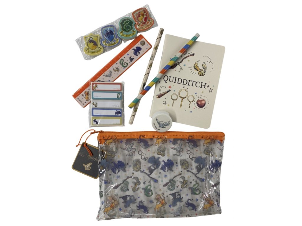 Sada obsahuje průhlednou gumovou taštičku na zip, deníček A6, 4 kolejní gumy, 2 obyčejné tužky, lepítka, ořezávátko a pravítko.