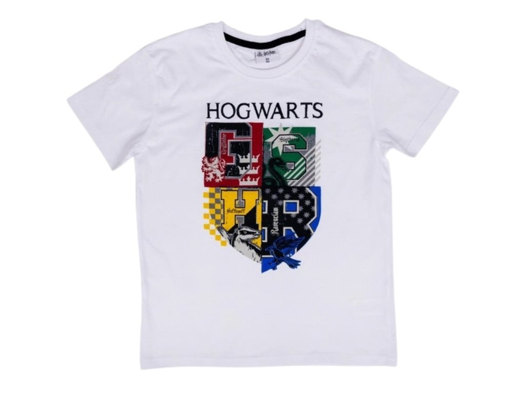 Dětské bílé tričko s kulatým výstřihem a s motivem erbu bradavické školy čar a kouzel a nápisem Hogwarts na přední straně.