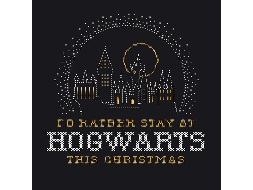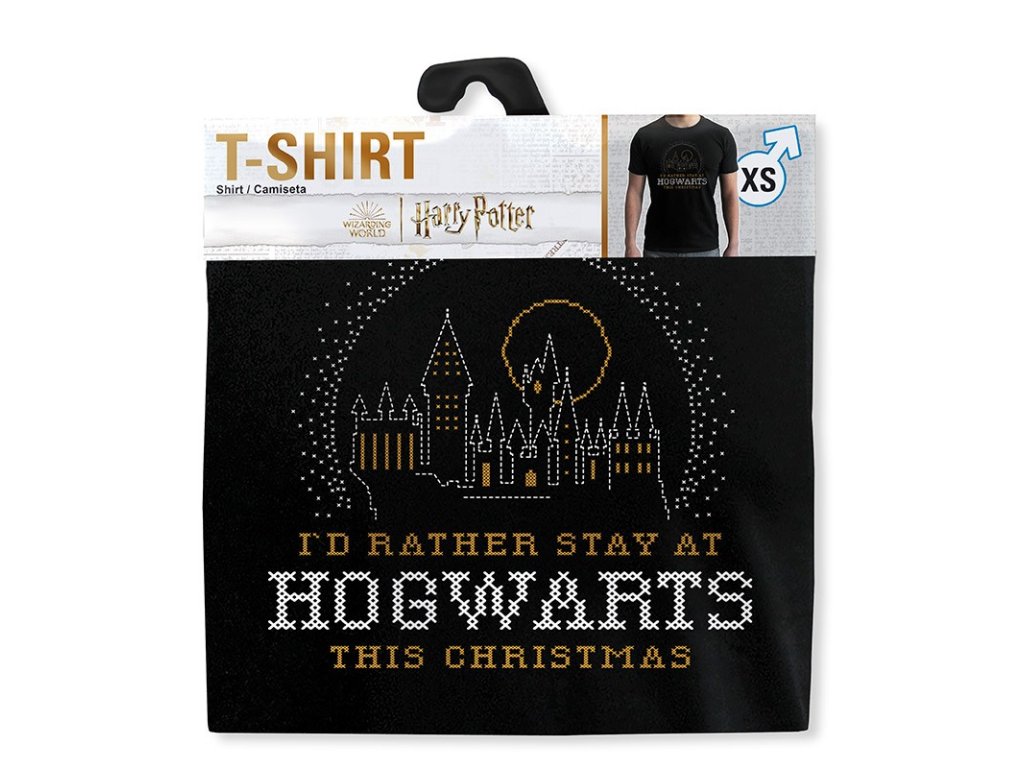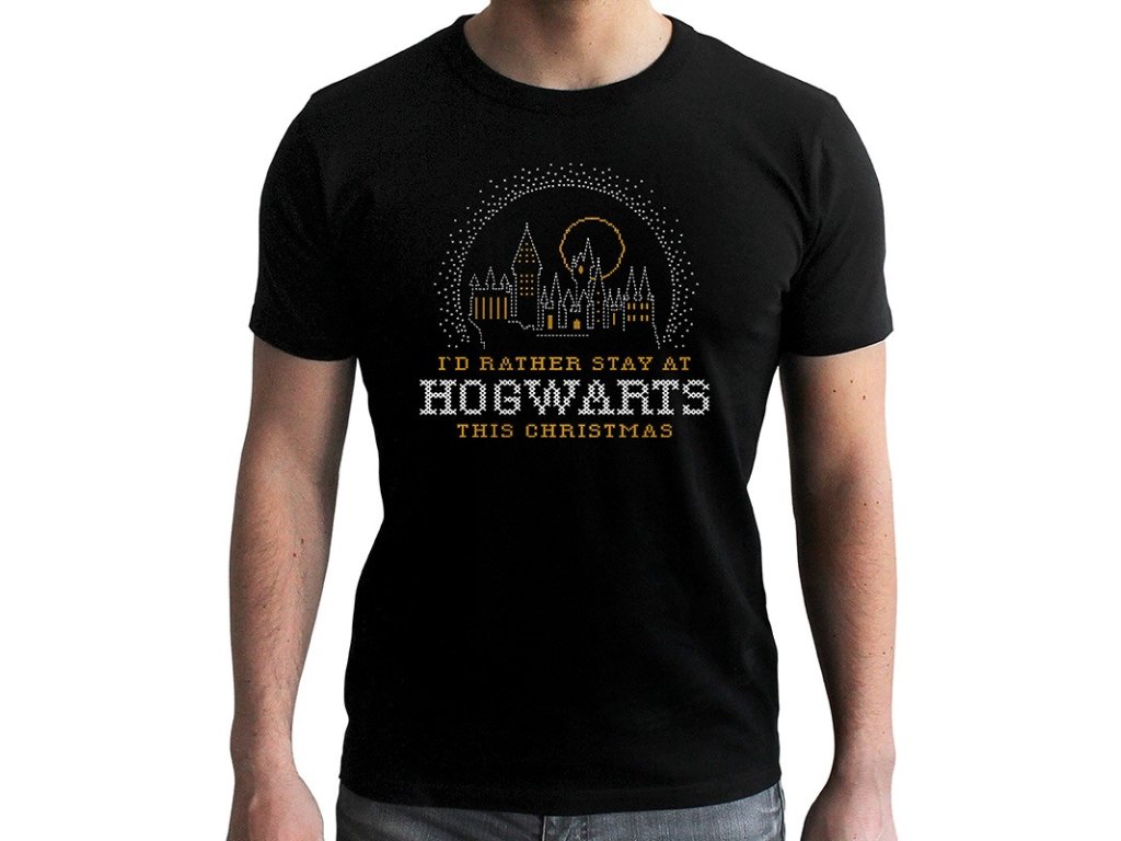 Pánské tričko s krátkým rukávem s bradavickým hradem a nápisem I´d rather stayed at Hogwarts this Christmas.