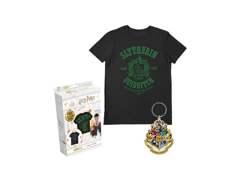 Unisex tričko s krátkým rukávem s motivem zmijozelské koleje v dárkové krabičce, součástí balení je i gumová klíčenka.