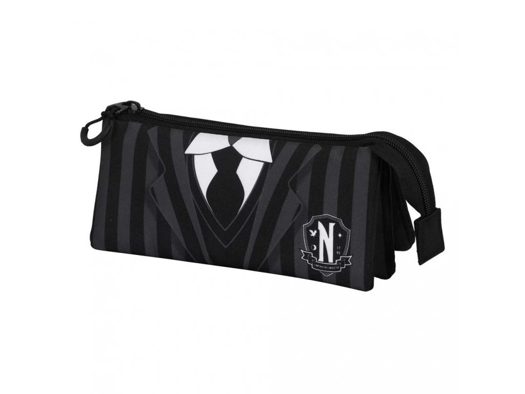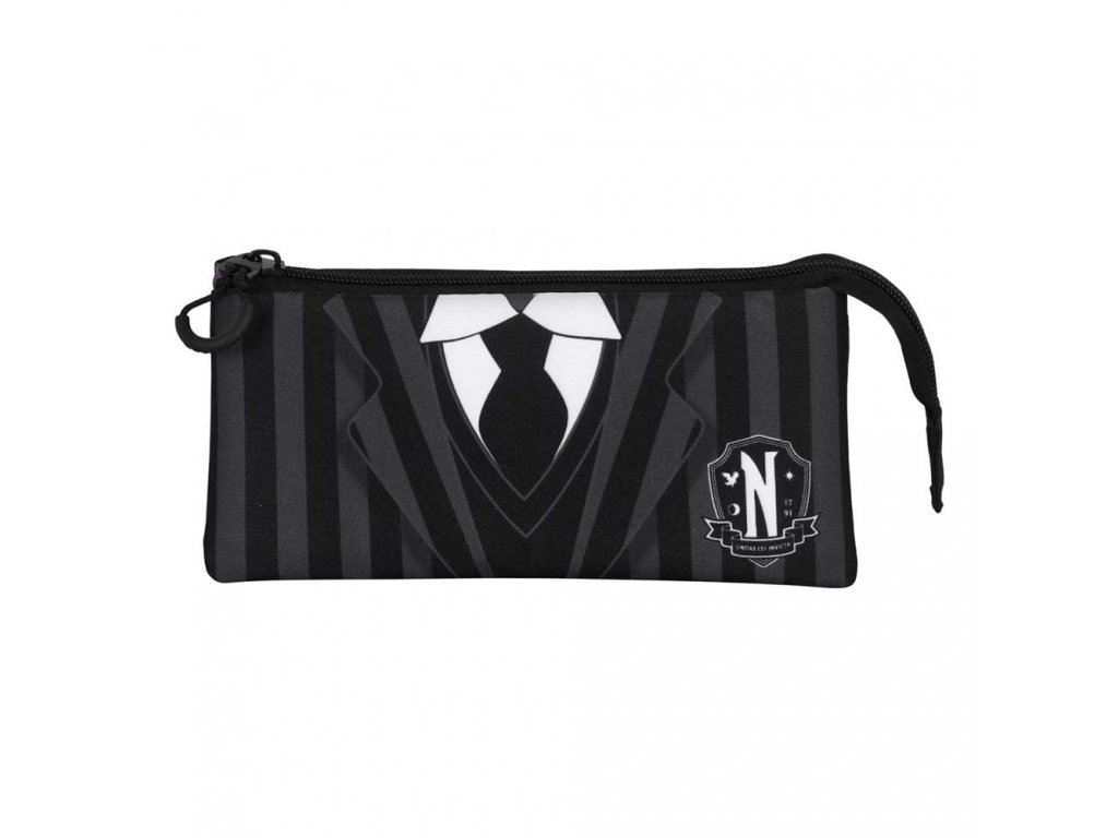 Praktický obdélníkový penál s motivem školní uniformy Wednesday. Nabízí tři samostatné komory na zip, které zajistí přehledné uložení všech psacích potřeb.Doplňkové parametry