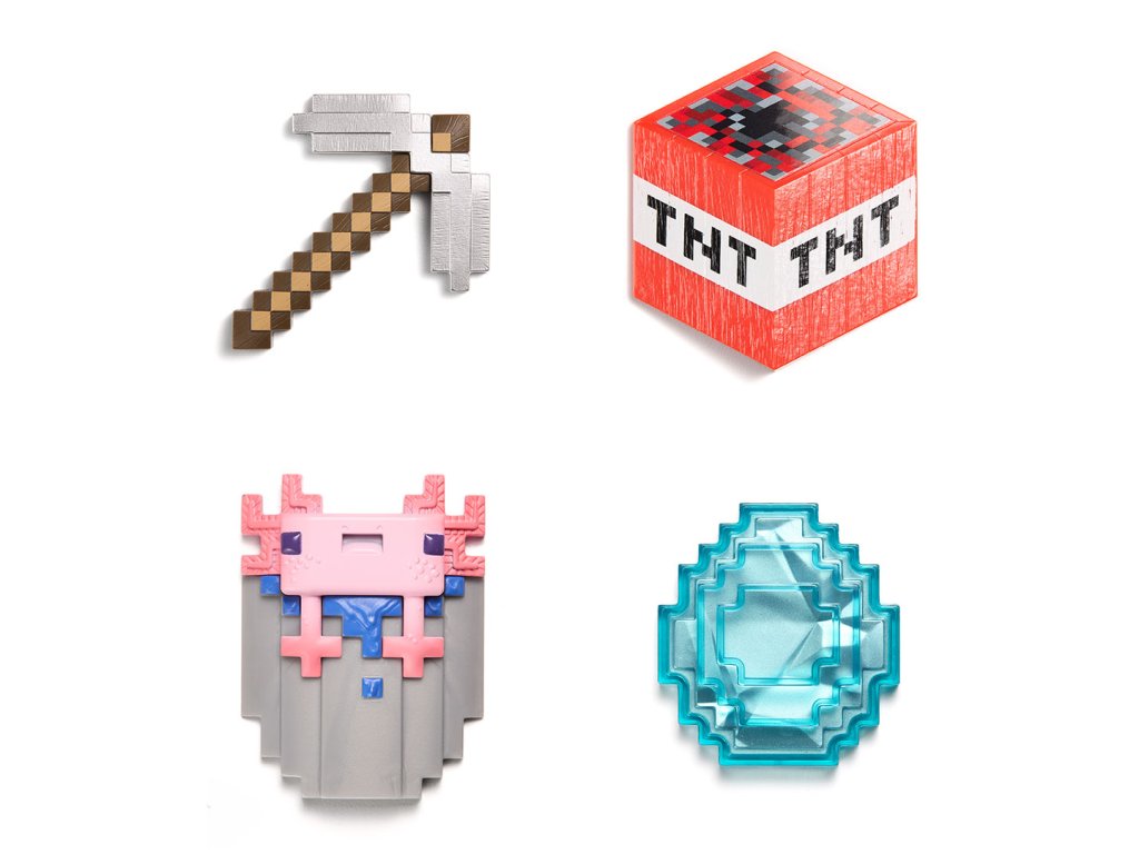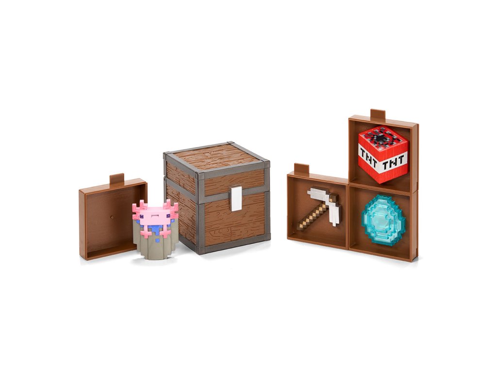 Tato truhla s inventářem z Minecraftu z první série: Biome Discoveries prozkoumává biom Caves a obsahuje železný krumpáč, TNT, kbelík s Axolotlem a diamant.Doplňkové parametry