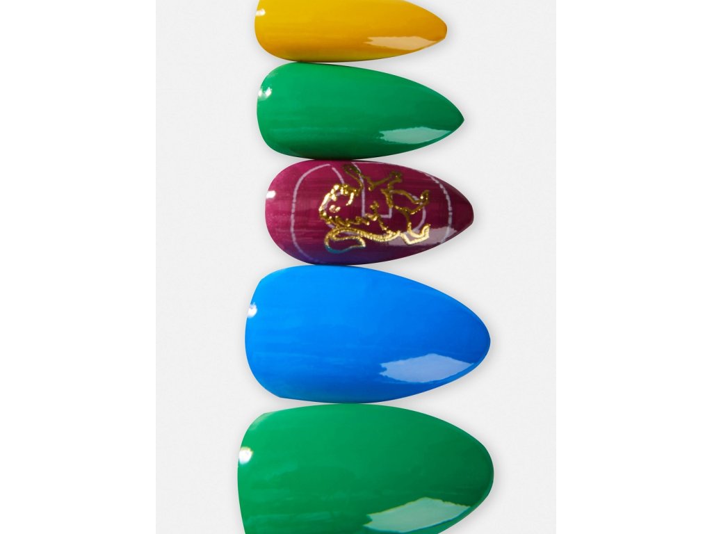 Umělé nalepovací nehty ve stylu oblíbených kolejí a kolejních barev.