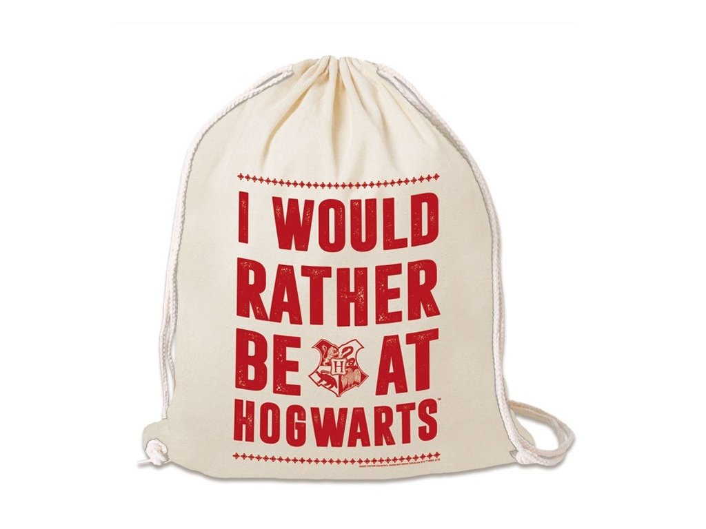 Béžový vak se stahovacími šňůrkami a nápisem I would rather be at Hogwarts (Raději bych byl/a v Bradavicích). Pytlík je vhodný například na přezůvky, sportovní potřeby nebo sportovní oblečení. Můžete ho využít i jako gym bag a nosit jej jako batoh na cvičení.