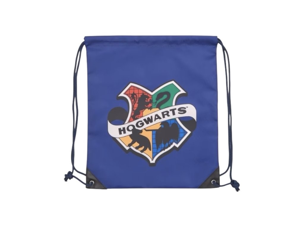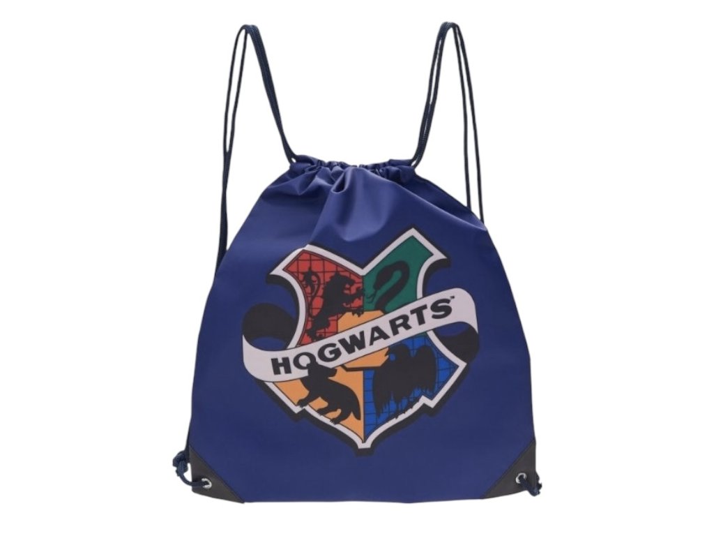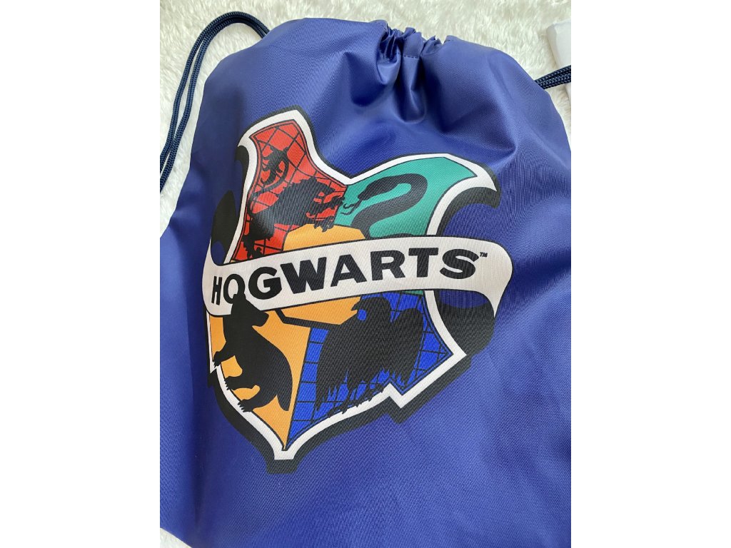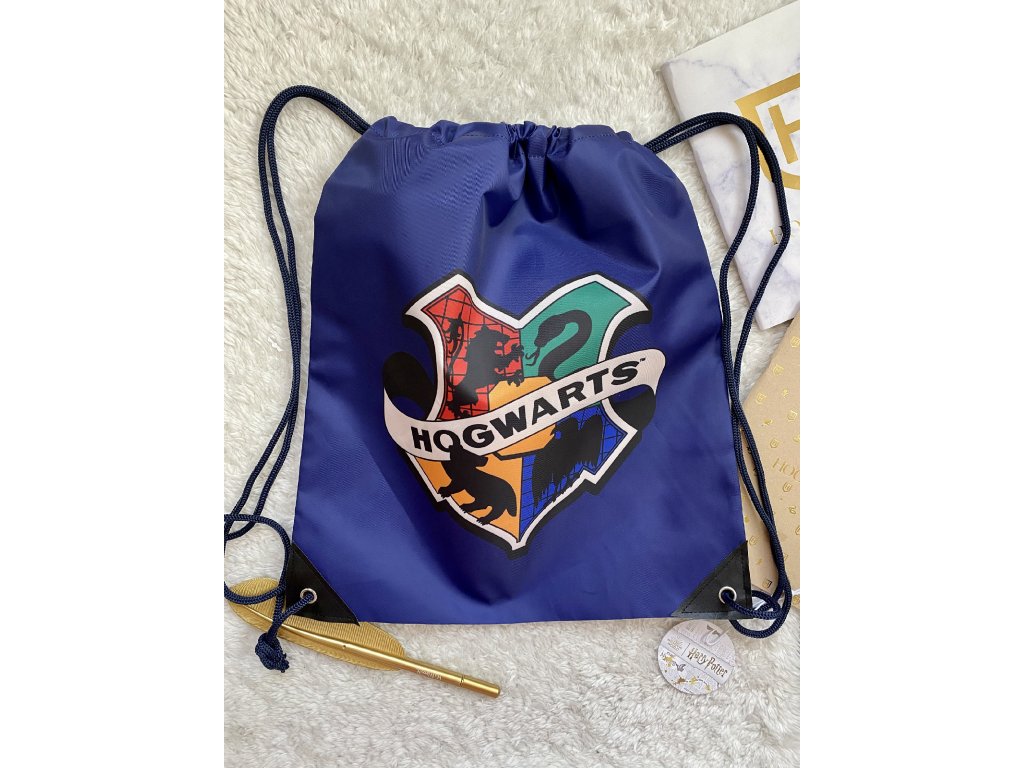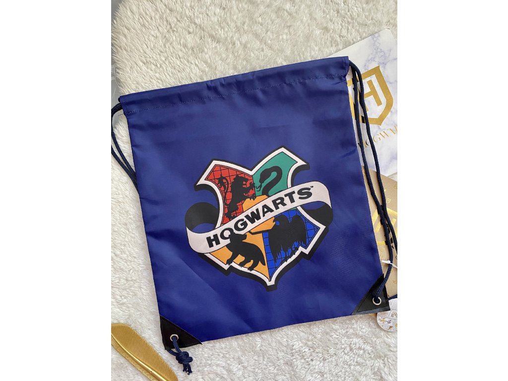 Modrý pytlík se stahovacími šňůrkami a barevným znakem Hogwarts. Je vhodný například na přezůvky, sportovní potřeby nebo sportovní oblečení.