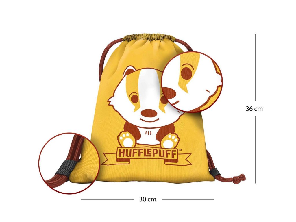 Žlutý pytlík s motivem bradavické koleje Mrzimor je potištěn typickým zvířetem pro tuto kolej - jezevcem a nápisem Hufflepuff.