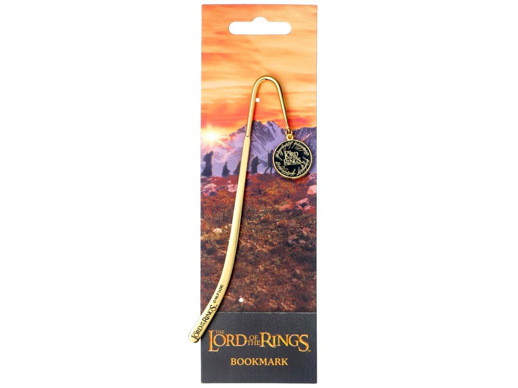 Stylová kovová záložka s logem Pána prstenů, ideální pro označení oblíbených míst v knihách. Vyrobena z odolného kovu s detailním rytým logem a elegantní zlatou stužkou, která dodává záložce klasický vzhled. Skvělý dárek pro čtenáře i fanoušky Tolkienovy trilogie.