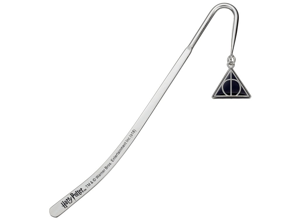 Postříbřená kovová knižní záložka s motivem Relikvií smrti z kouzelnické ságy Harry Potter.