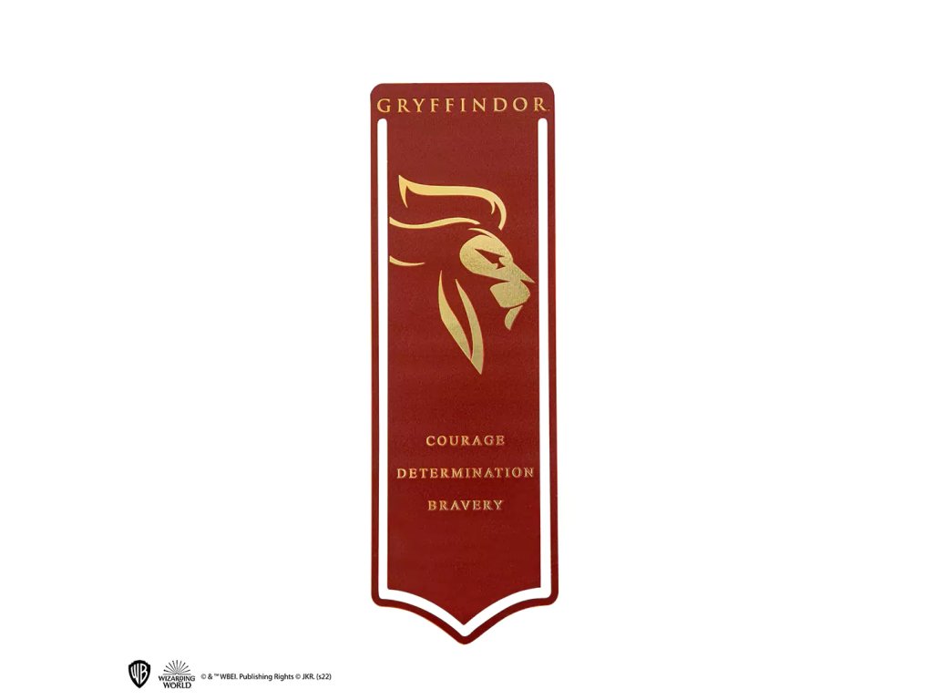 Stylová kovová záložka s motivem nebelvírské koleje (Gryffindor) ze školy čar a kouzel v Bradavicích. Záložku zdobí zvíře typické pro tuto kolej - lev.