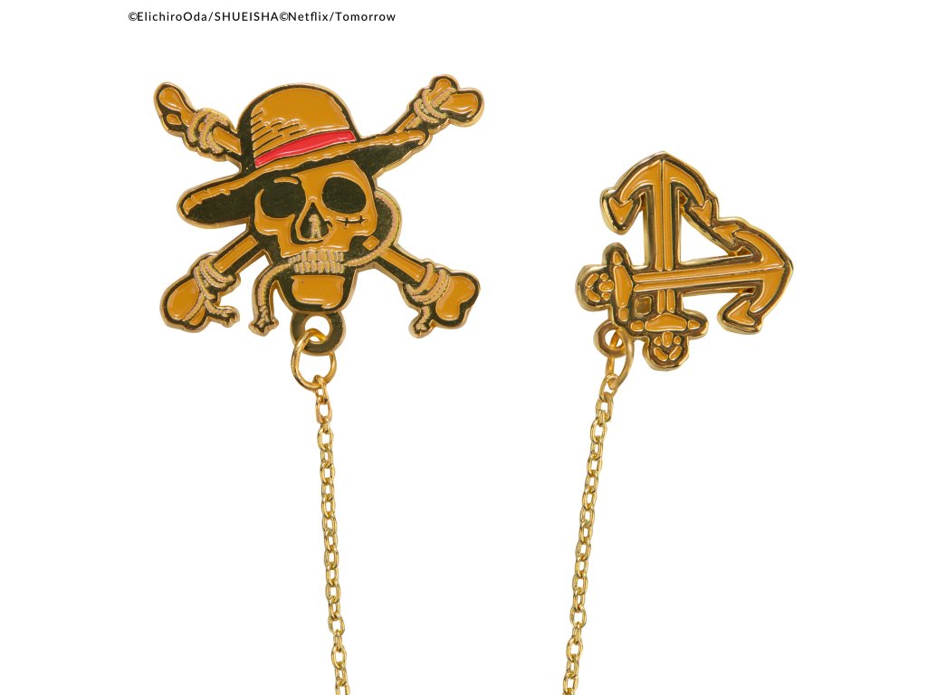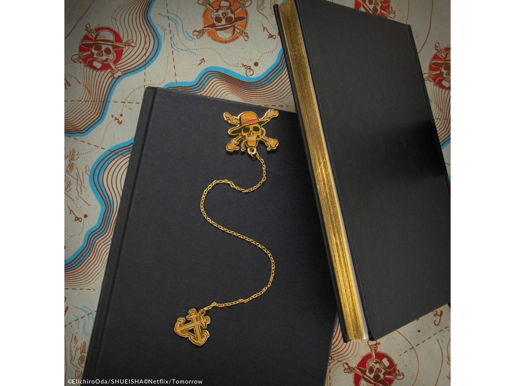 Umístěte Jolly Roger na horní okraj knihy a kotvu na spodní, jako by se ponořila pod hladinu moře. Jolly Roger i kotva jsou precizně vypracovány v nádherném zlatém tónu s červeným detailem slaměného klobouku.