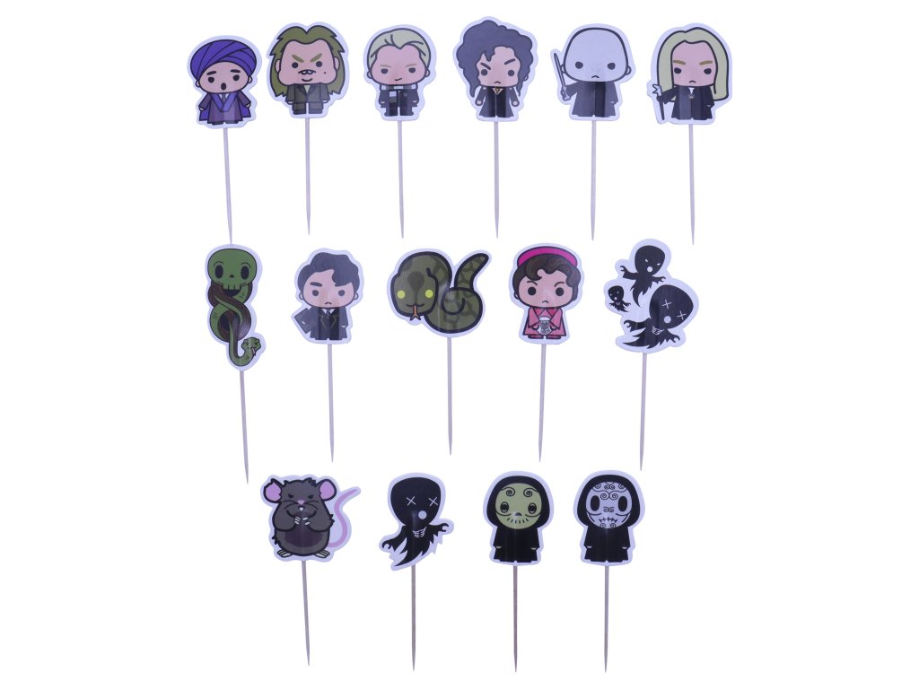 V balení najdete 15 kusů zápichů: prof. Quirrell, Červíček, Draco Malfoy, Bellatrix Lestrangeová, Lord Voldemort, Lucius Malfoy, znamení zla, Tom Raddle, Nagini, prog. Umbridgeová, Prašivka, Mozkomorové, a Smrtijedi.