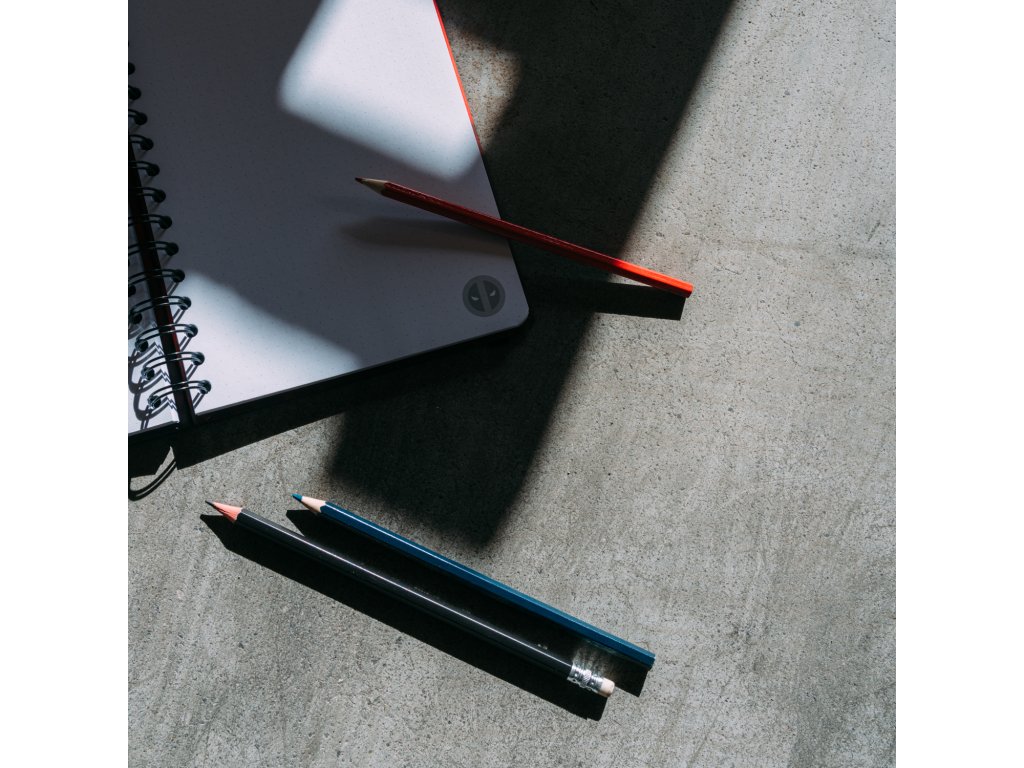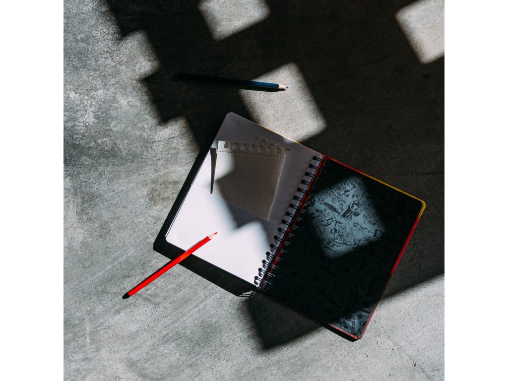 Poznámkový blok A5 s pevnou vazbou. Matná laminovaná deska, personalizovaný vnitřní prvek, zaoblené rohy, drátěná vazba, kapsa a zapínání na gumičku. Obsahuje 90 listů (180 stran) o gramáži 100 g/m².Doplňkové parametry