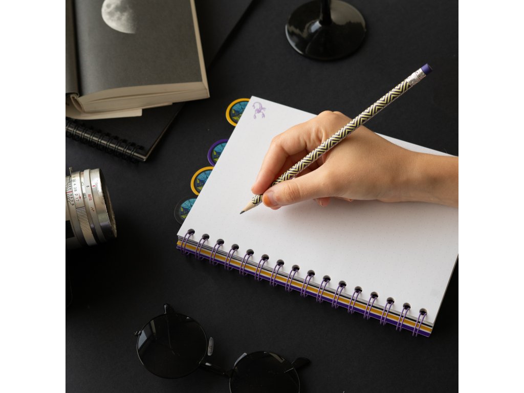 Zápisník A5, kroužková vazba s personalizovaným matným měkkým obalem, personalizovaným vnitřním obalem, vazbou drátem a personalizovaným vnitřkem s kuličkami. Obsahuje 80 listů (160 stran) papíru o gramáži 80 g/m². Součástí jsou čtyři personalizované přepážky.Doplňkové parametry