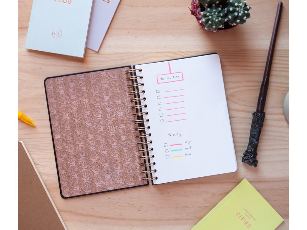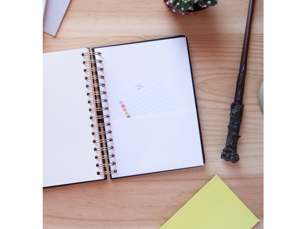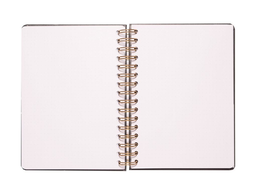 Poznámkový blok A5 s pevnou vazbou. Matná laminovaná deska, personalizovaný vnitřní prvek, zaoblené rohy, drátěná vazba, kapsa a zapínání na gumičku. Obsahuje 90 listů (180 stran) o gramáži 100 g/m².Doplňkové parametry