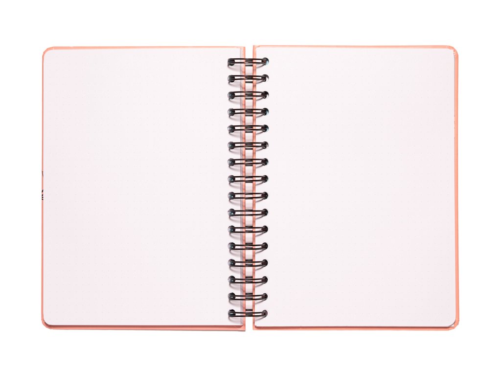 Poznámkový blok A5 s pevnou vazbou. Matná laminovaná deska, vnitřní strana s kuličkami, zaoblené rohy, drátěná vazba, kapsa a zapínání na gumičku. Obsahuje 90 listů (180 stran) o gramáži 100 g/m².Doplňkové parametry