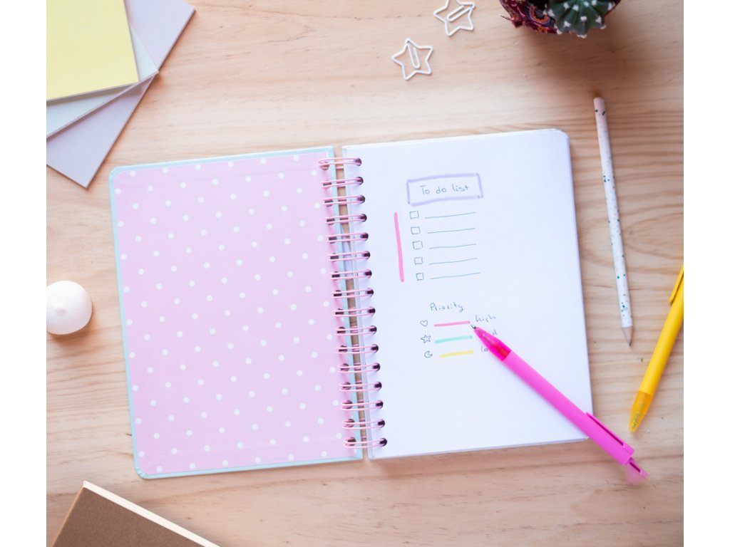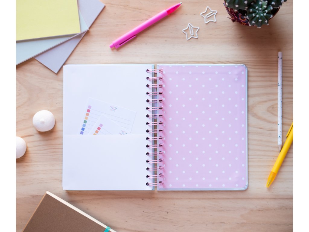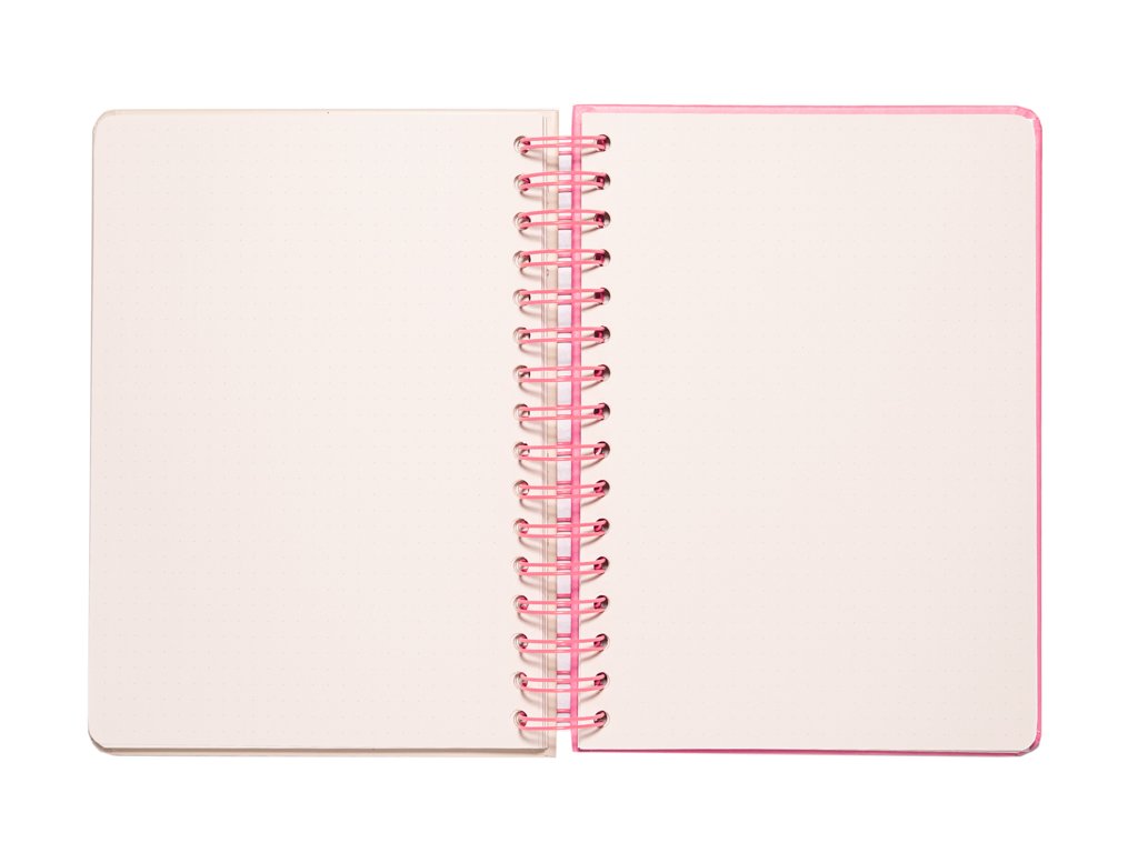 Poznámkový blok A5 s pevnou vazbou. Matná laminovaná deska, vnitřní strana s kuličkami, zaoblené rohy, drátěná vazba, kapsa a zapínání na gumičku. Obsahuje 90 listů (180 stran) o gramáži 100 g/m².Doplňkové parametry