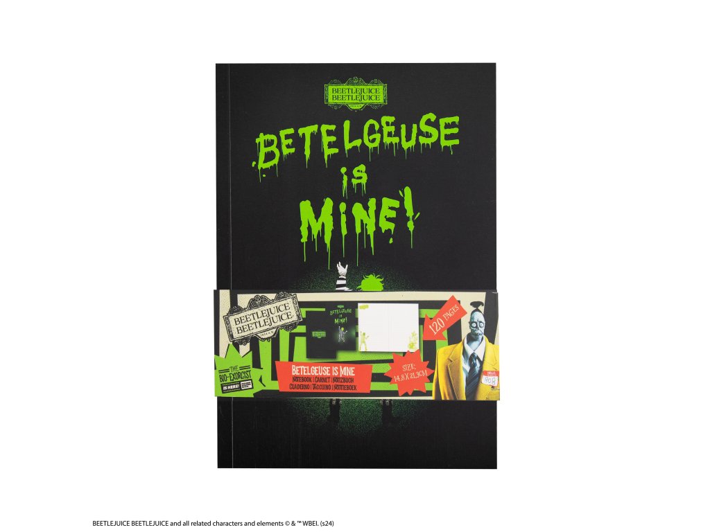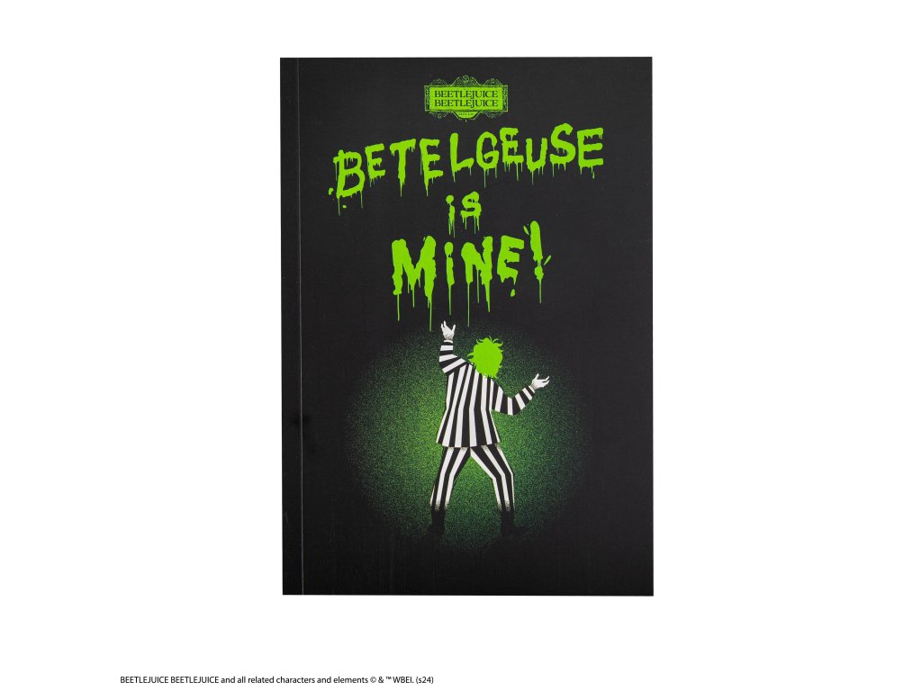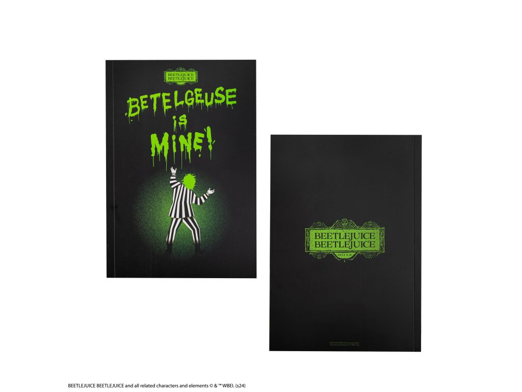 Zápisník „Betelgeuse je můj“ je s měkkou obálkou. Na obálce stojí samotný Beetlejuice v ikonickém černobílém pruhovaném obleku, zamrzlý ve své charakteristické póze, a dodává zápisníku nádech nadpřirozena.