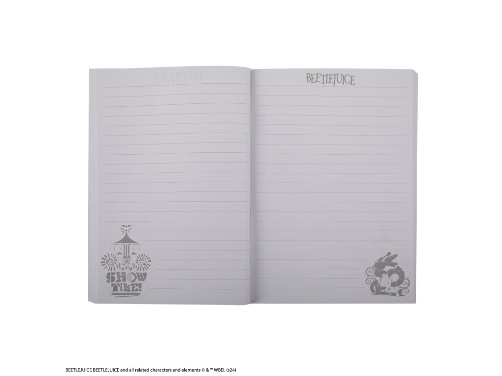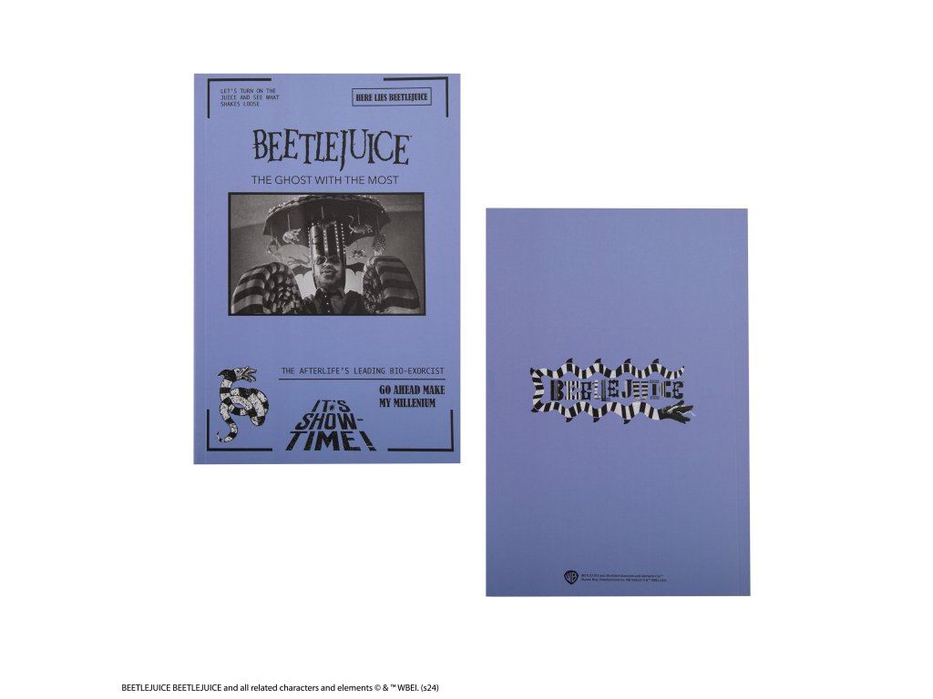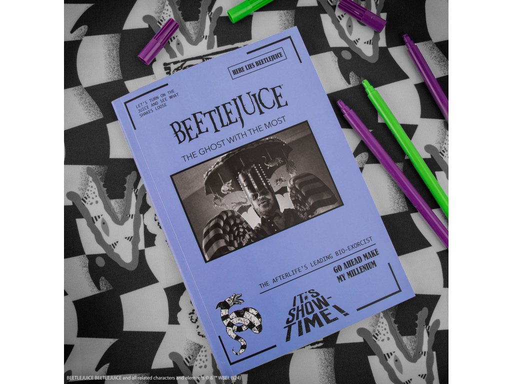 Zápisník „je čas na show!“ s měkkou obálkou je hravou poctou podivuhodnému a charismatickému světu Beetlejuice. Fialový zápisník zdobí výrazný černobílý obrázek Beetlejuice s kolotočem na hlavě, který dokonale vystihuje jeho výstřední povahu.