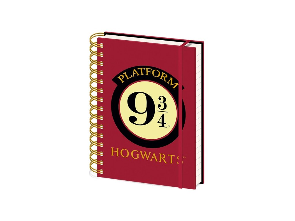 Linkovaný blok velikosti A5 s kroužkovou vazbou, tvrdými deskami a 90 linkovanými listy inspirovaný slavným Nástupištěm 9 a 3/4 s červenou gumičkou stahující celý deník.
