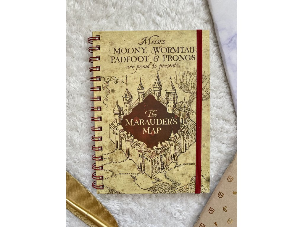 Béžový linkovaný blok velikosti A5 s kroužkovou vazbou, tvrdými deskami a 90 linkovanými listy inspirovaný Pobertovým plánkem s červenou gumičkou stahující celý deník.