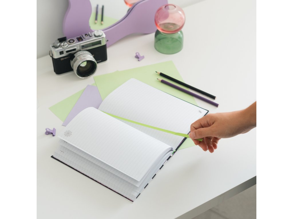Poznámkový blok A5 s pevnou vazbou. Matná laminovaná deska s měkkou texturou, vnitřní strana s vlastní linkou, rovné rohy, lepená vazba, záložková stuha, kapsa a zapínání na gumičku. Obsahuje 96 listů (192 stran) o gramáži 100 g/m2.Doplňkové parametry