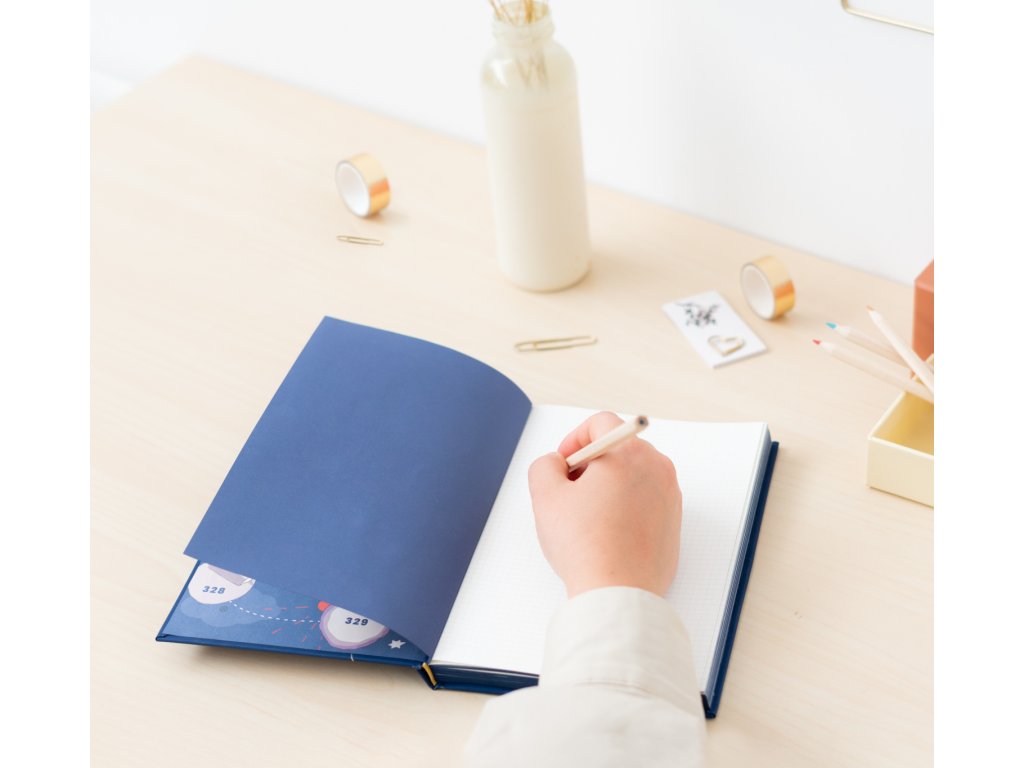 Poznámkový blok A5 s pevnou vazbou. Vyznačuje se měkkou matnou laminovanou deskou, personalizovaným vnitřním prostorem, rovnými rohy, lepenou vazbou a záložkou se stuhou. Obsahuje 96 listů (192 stran) o gramáži 100 g/m².Doplňkové parametry