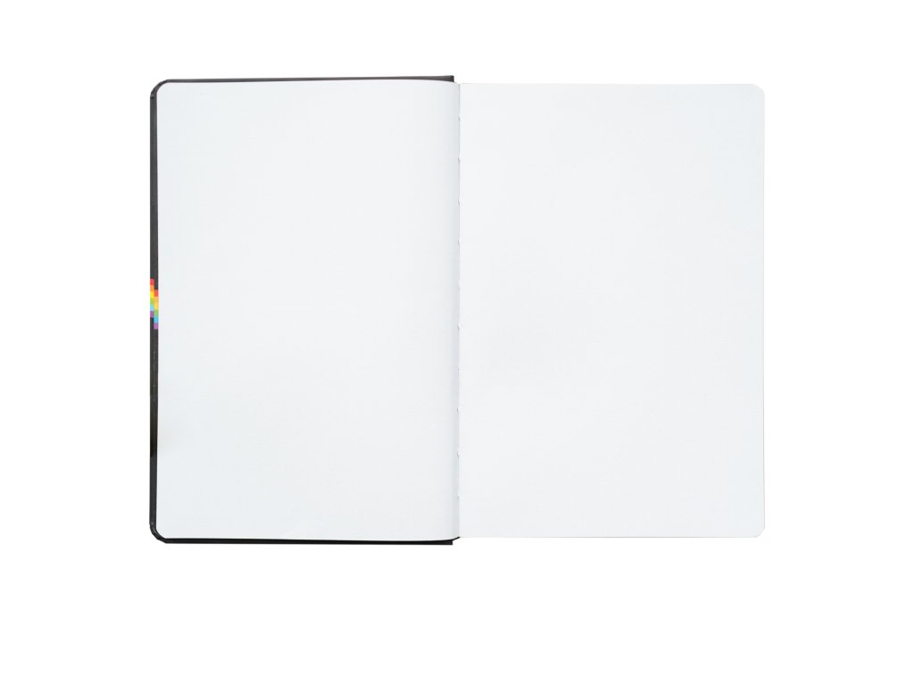 Poznámkový blok A5 s pevnou vazbou. Má měkkou matnou laminovanou desku, hladký vnitřek, zaoblené rohy, lepenou vazbu a záložku se stuhou. Obsahuje 90 listů (180 stran) o gramáži 100 g/m².Doplňkové parametry