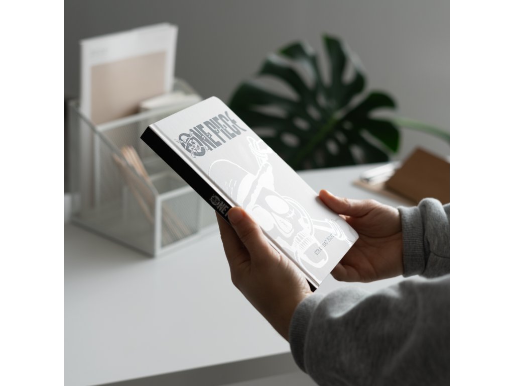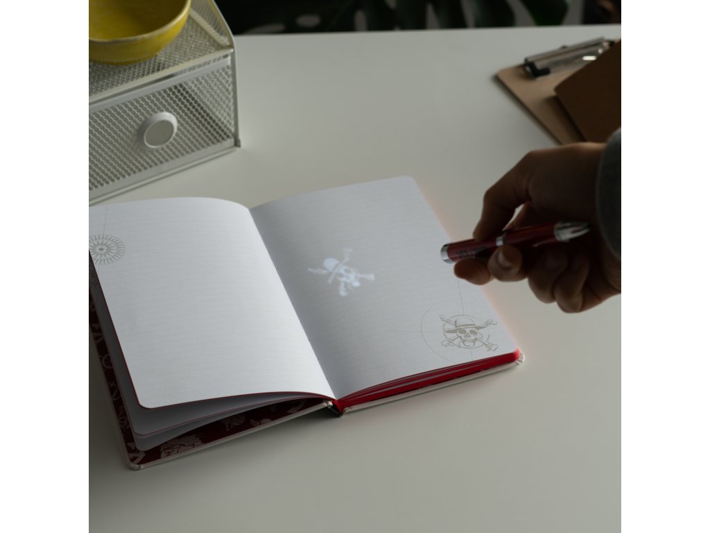 Poznámkový blok A5 s pevnou vazbou a projektorovým perem. Vyznačuje se matnou laminovanou deskou s měkkým povrchem, personalizovaným linkovaným vnitřkem, zaoblenými rohy, lepenou vazbou, kapsou a záložkou se stuhou. Obsahuje 96 listů (192 stran) o gramáži 100 g/m². Součástí je také pero, které promítá obraz stisknutím tlačítka na těle pera a je napájeno 4 bateriemi AG3 1,5 V (součástí balení).Doplňkové parametry