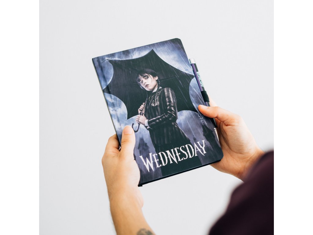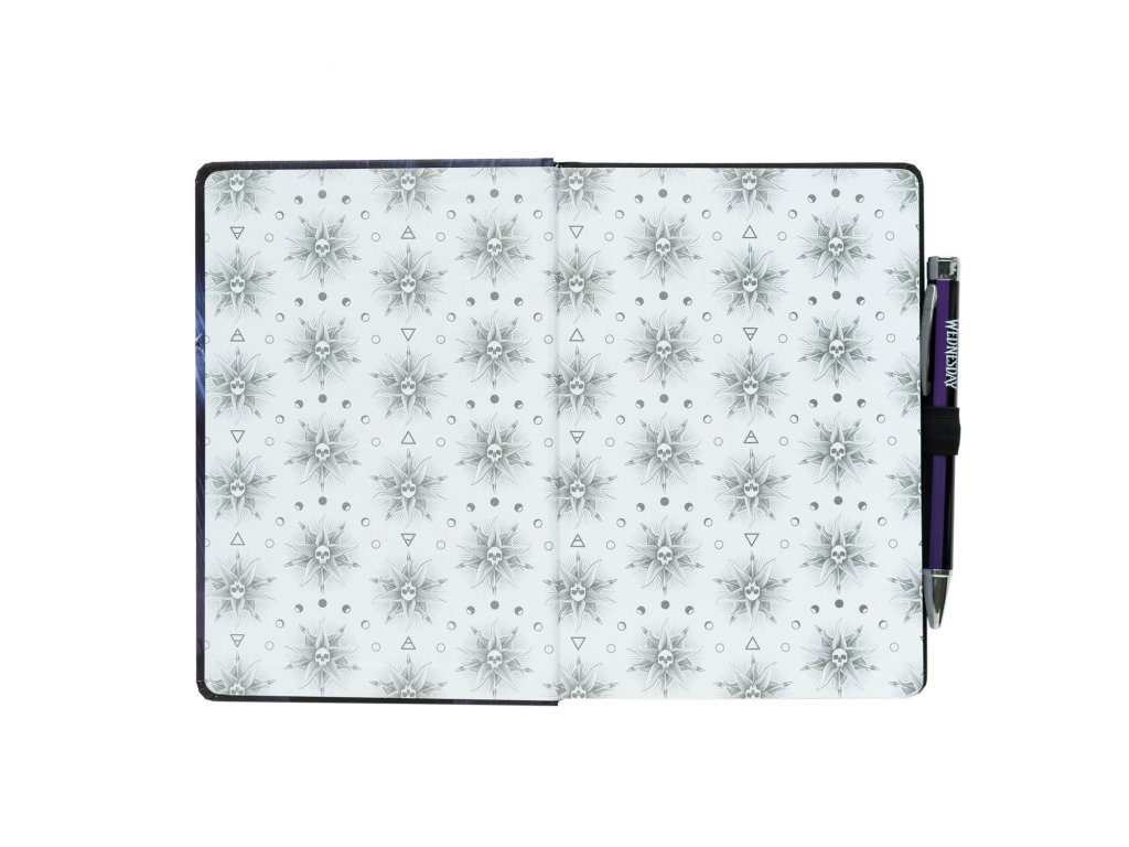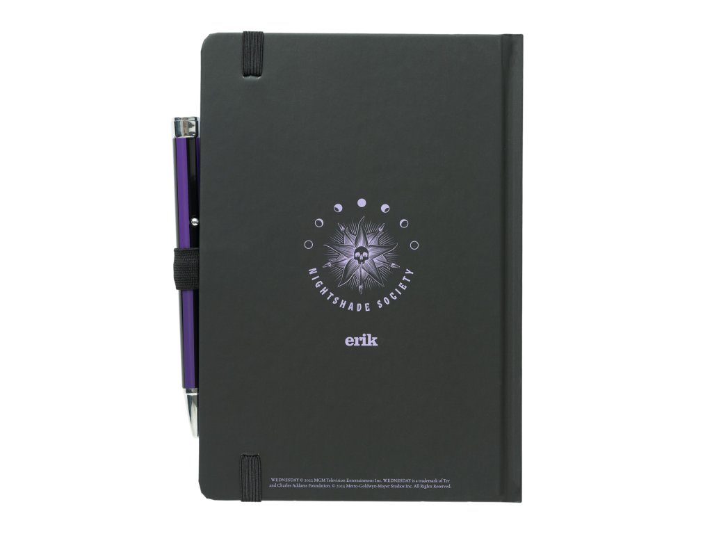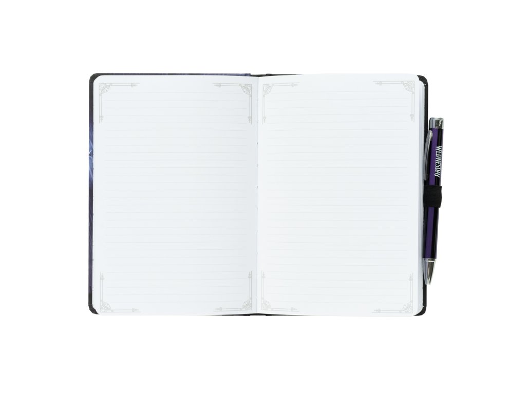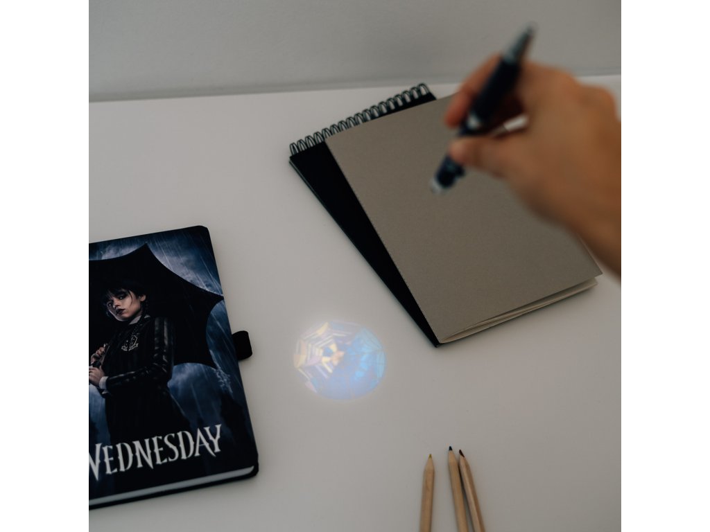 Poznámkový blok A5 s pevnou vazbou a projekčním perem. Matný laminovaný obal s měkkou vazbou, personalizovaný linkovaný vnitřek, zaoblené rohy, lepená vazba, záložka se stuhou, kapsa a zapínání na gumičku. Obsahuje 96 listů (192 stran) o gramáži 100 g/m². Součástí je také pero, které promítá obraz stisknutím tlačítka na těle pera a je napájeno 4 bateriemi AG3 1,5 V (součástí balení).Doplňkové parametry