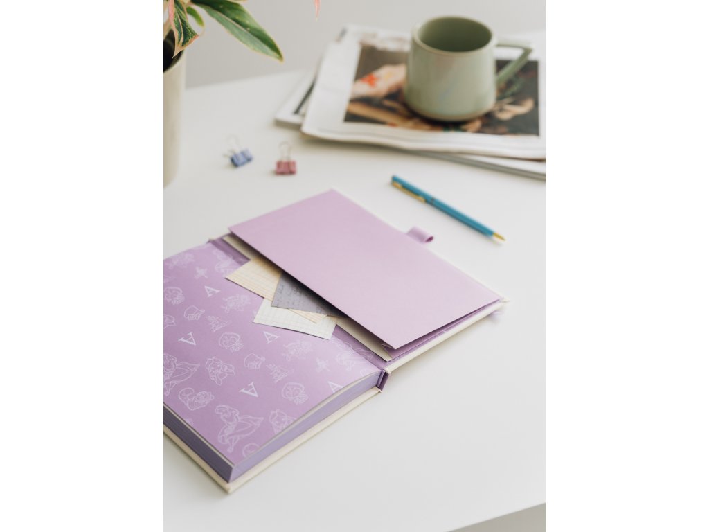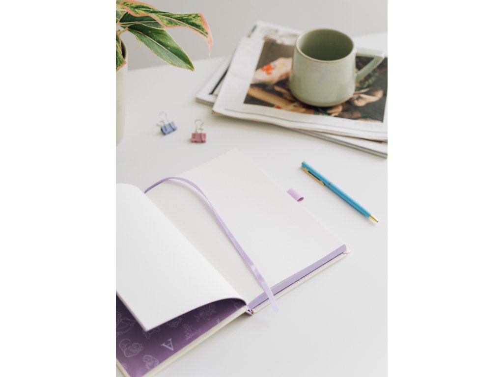 Poznámkový blok A5 s pevnou vazbou a perem. Matná laminovaná deska s nadýchaným efektem a měkkým omakem, hladký vnitřek, hranaté rohy, lepená vazba, kapsa a záložka se stuhou. Obsahuje 96 listů (192 stran) o gramáži 100 g/m².Doplňkové parametry