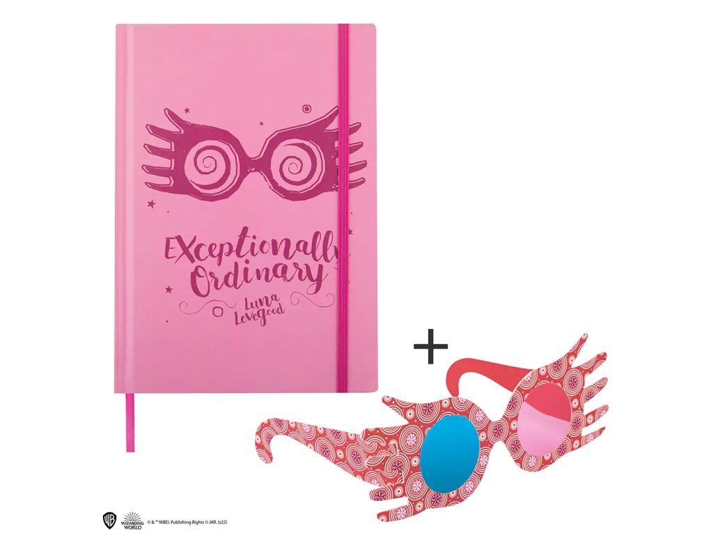 Růžový linkovaný zápisník velikosti A5 v pevné vazbě s motivem brýlí typických pro Lenku Láskorádovou a nápisem Exceptionally Ordinary.