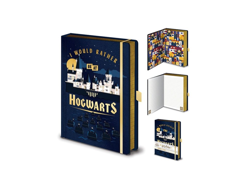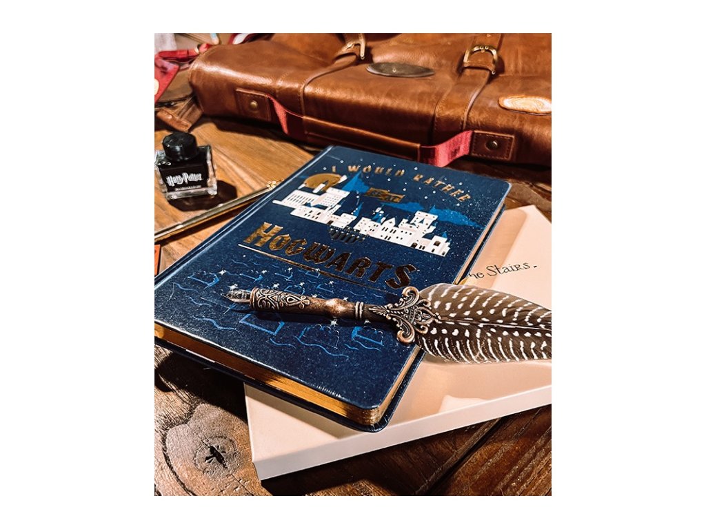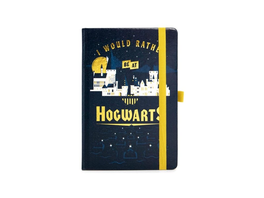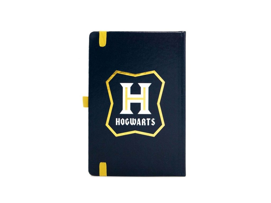 Krásný modrý zápisník s pevnou vazbou, který je designem stylizovaný do kouzelnické školy v Bradavicích.