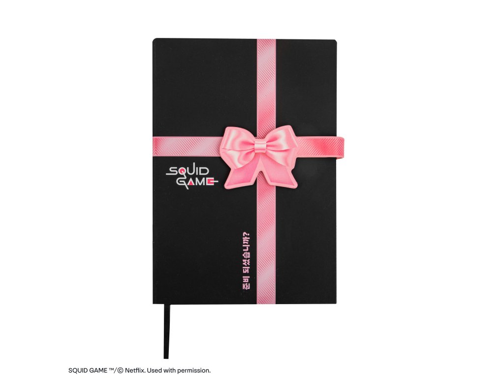 Zápisník v hluboké černé barvě je ozdoben jemnou světle růžovou mašlí, připomínající dekorace na rakvích vyřazených soutěžících ze seriálu.