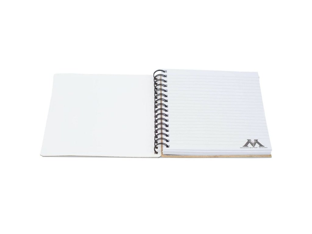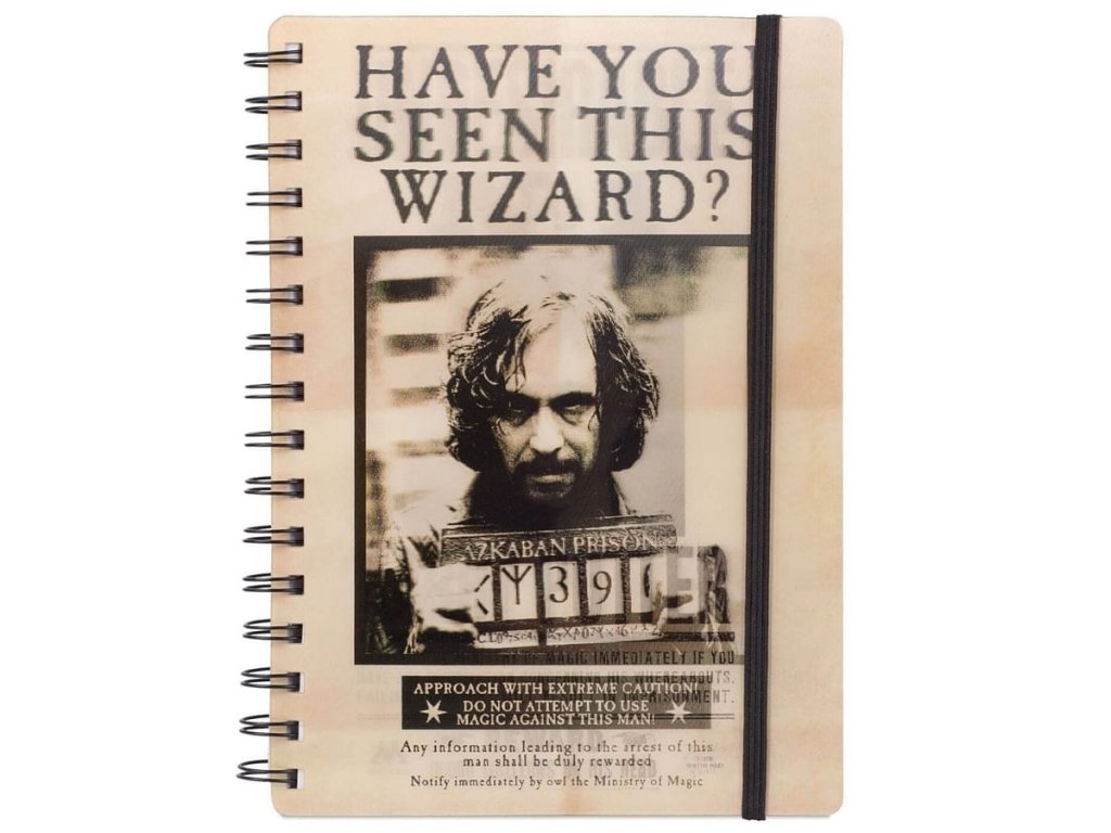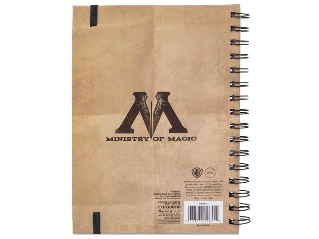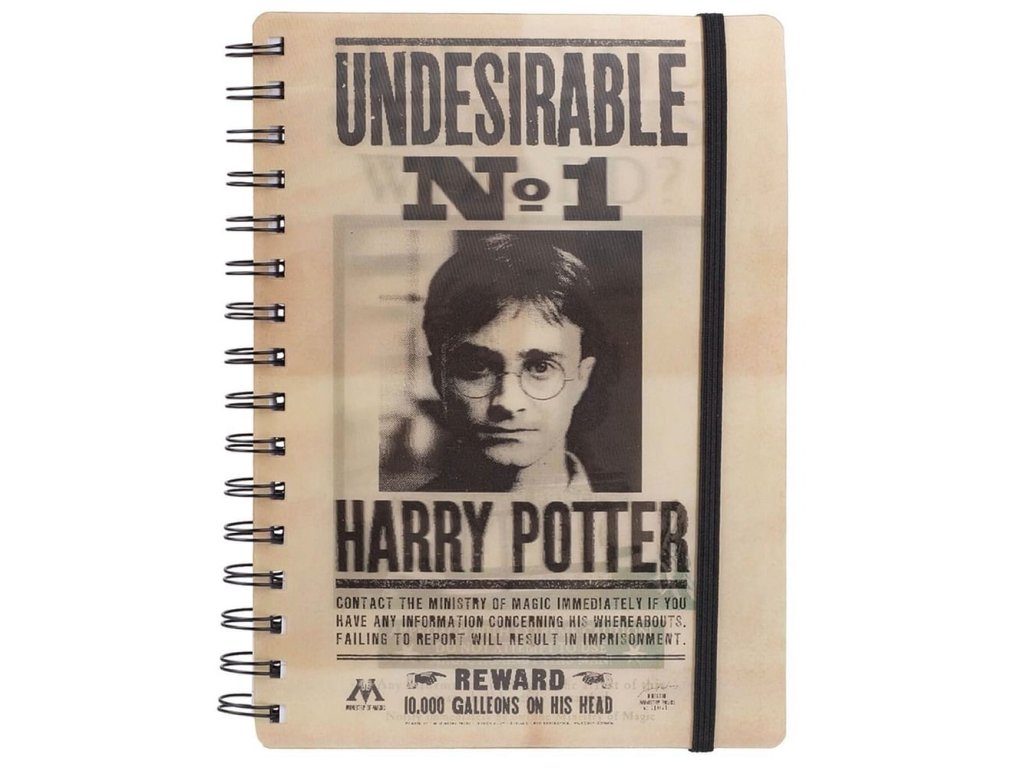 Béžový linkovaný blok velikosti A5 s kroužkovou vazbou, tvrdými deskami a 90 linkovanými listy inspirovaný plakáty Have you seen this wizard a Undesirable s černou gumičkou stahující celý deník.