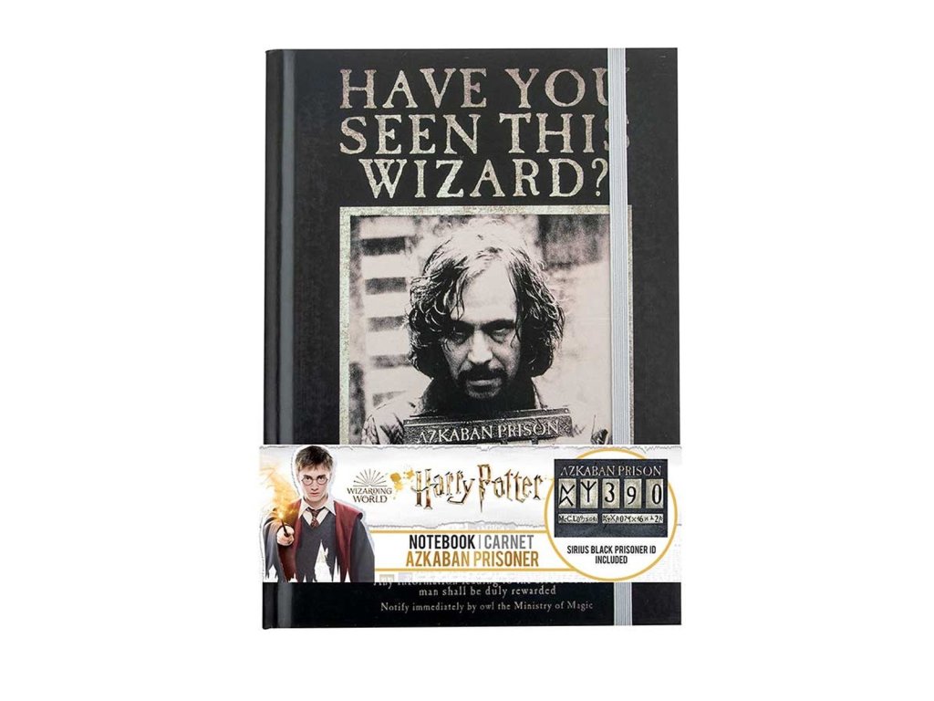 Elegantní černý zápisník s pevnou vazbou s elastickým uzávěrem (gumičkou) a motivem Siriuse Blacka v Azkabanu.