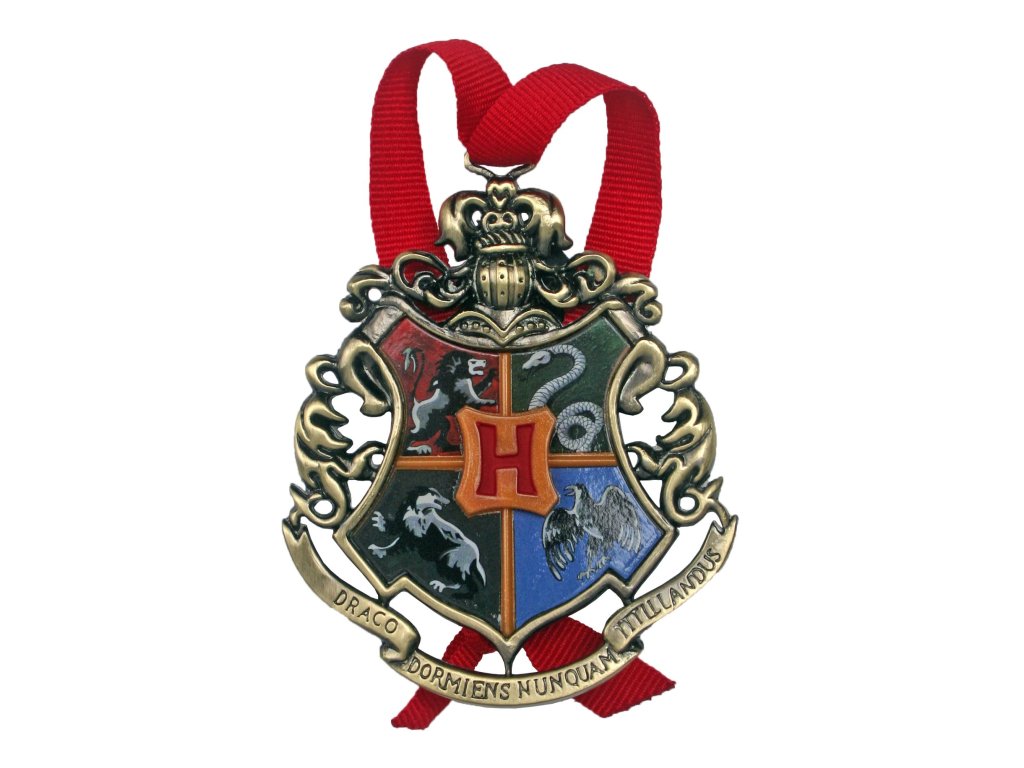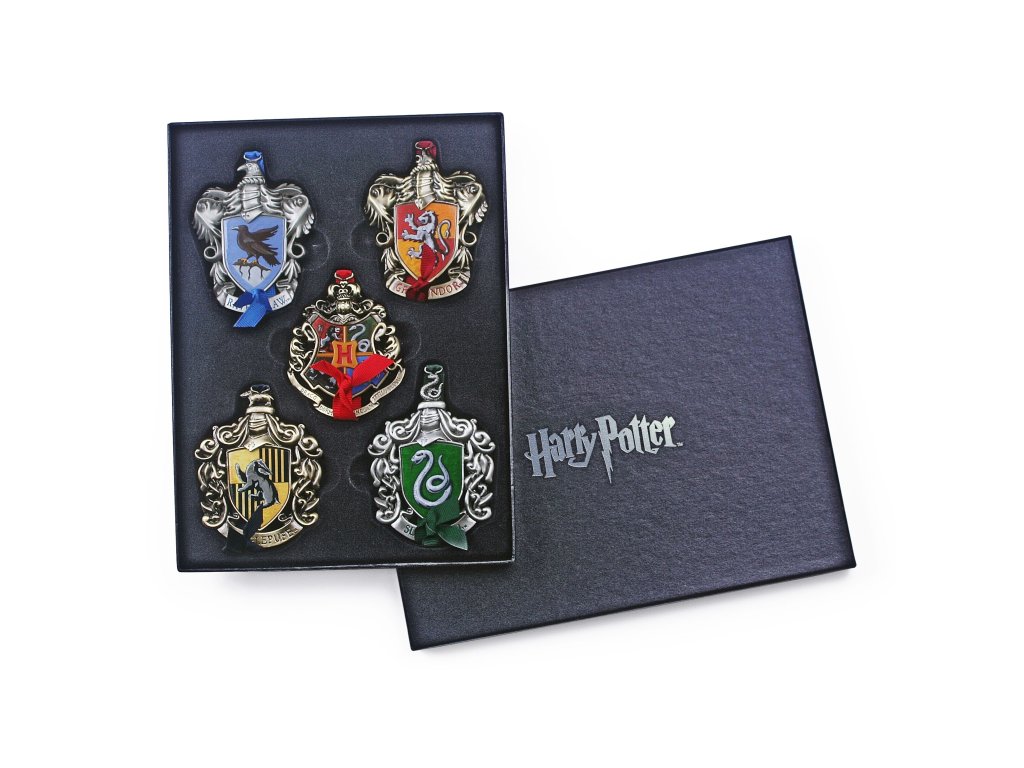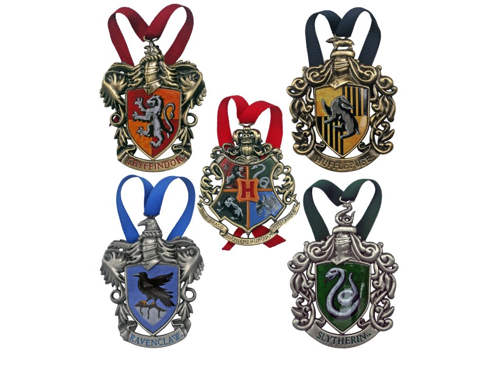 Sada 5 kovovvých vánočních ozdob s motivy kolejních znaků Bradavic, včetně sběratelské krabičky. V sadě jsou znaky pro Bradavickou školu a koleje Nebelvír, Zmijozel, Mrzimor a Havraspár. Měří přibližně 10 cm.Doplňkové parametry