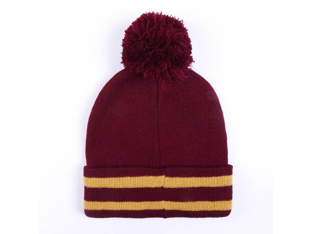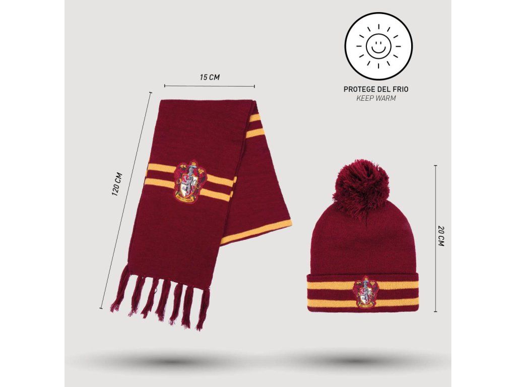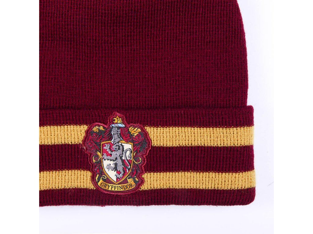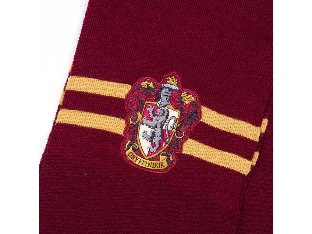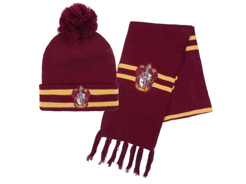 Sada zimní čepice a šály ve stylu nebelvírské koleje s erbem a nápisem Gryffindor.