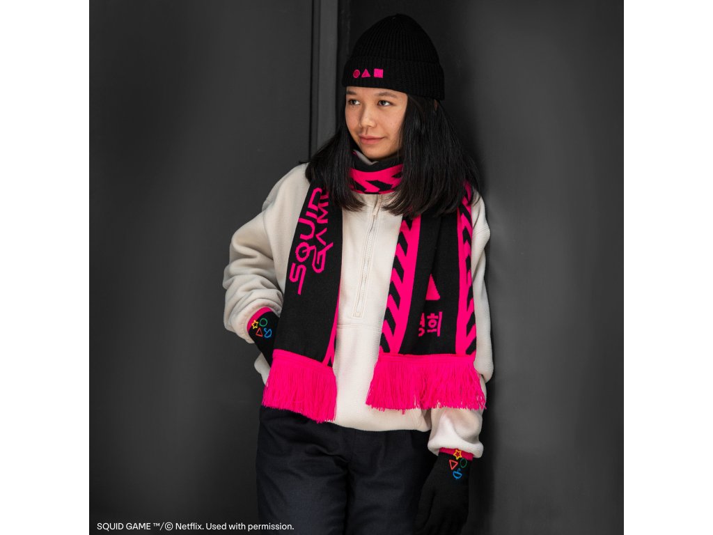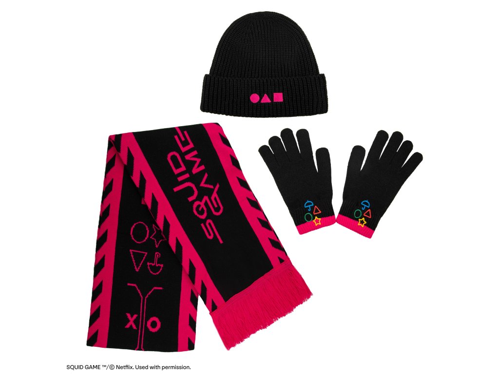 Vychutnejte si pohodovou atmosféru s naší zimní sadou Squid Game, dokonalým vybavením pro fanoušky tohoto hitového seriálu! Tato stylová sada obsahuje pohodlnou černou čepici a rukavice, obojí zdobené ikonickými tvary ze seriálu, a zářivě růžovo-černou šálu s nápisem „Squid Game“.
