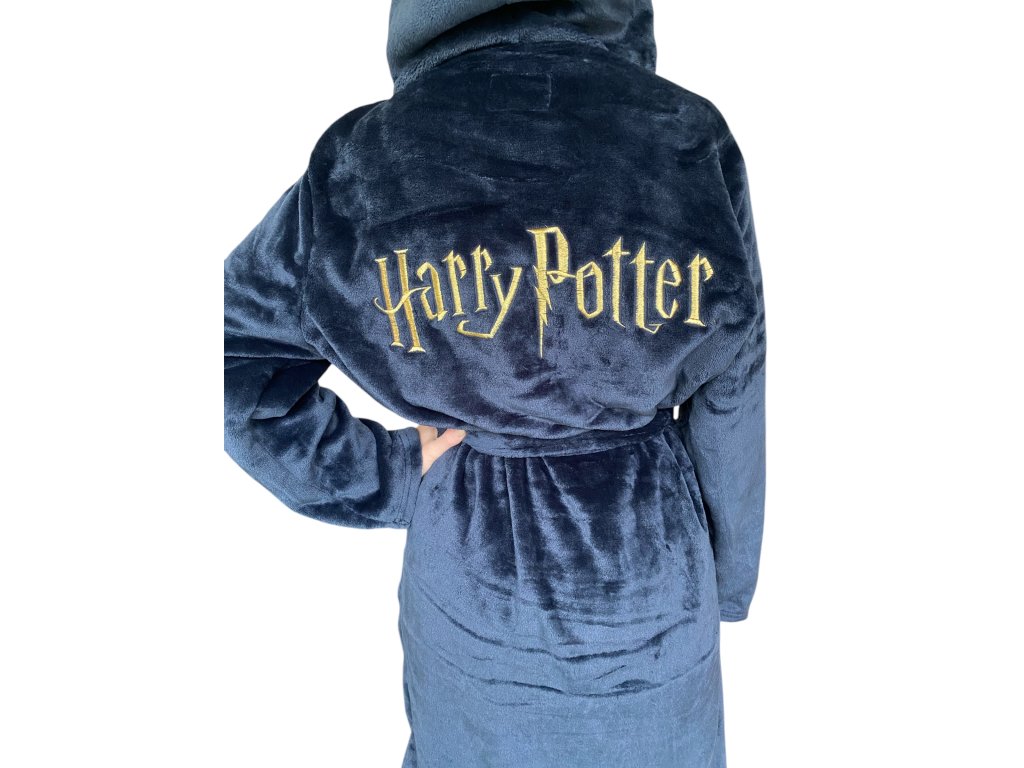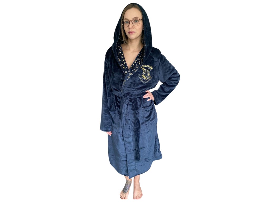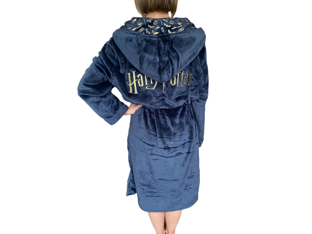 Heboučký tmavě modrý dámský župan zdobený zlatým bradavickým erbem, zlatými symboly na kapuci a nápisem Harry Potter na zádech.